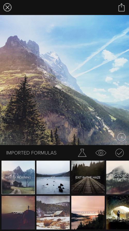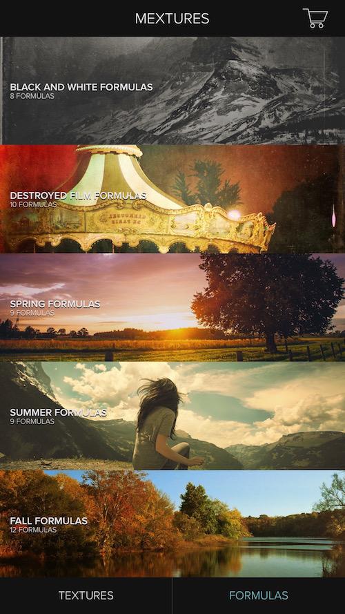 After selecting an image from your photo library, you can select "TEXTURES" to begin creating your own formula, or select "FORMULAS" to use any of the included formulas.